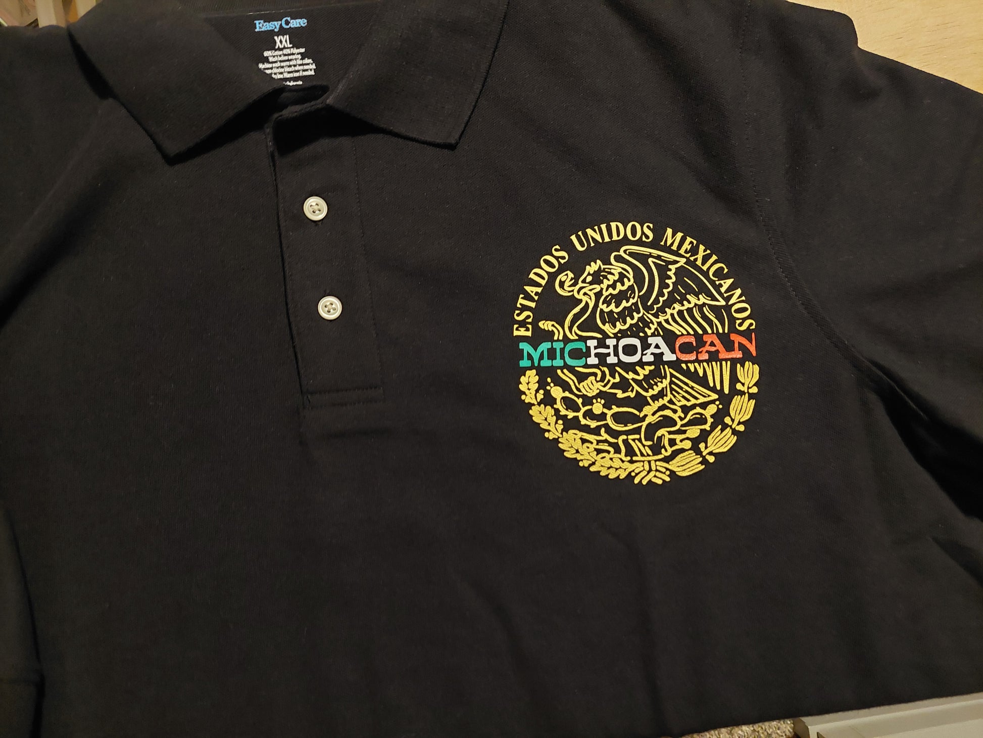 Polo shirt with Mexican logo can customize the state or city and last name on the sleeve.